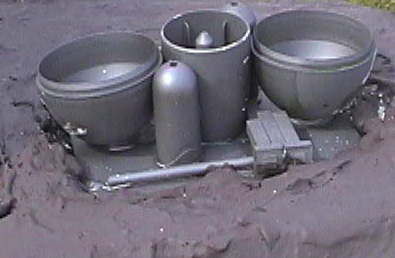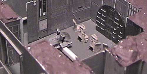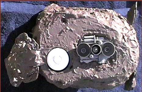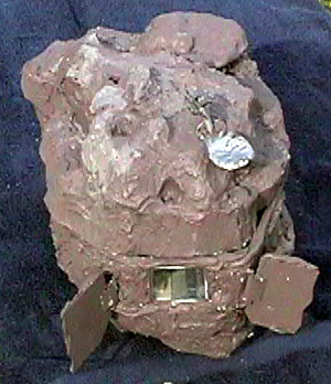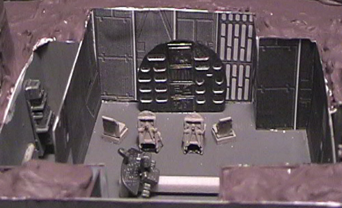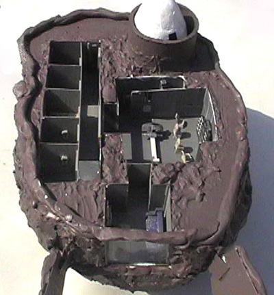 Scale: Not Stated This project is a scratchbuilt version of an asteroid starship from the Classic Traveller role-playing adventure "Expedition to Zhodane." I've been meaning to build it for a long time, but it took this contest to get me to sit down and do it. This ship is not only tunneled out of an asteroid, but also designed to be able to masquerade as an ordinary space rock by closing sculpted shutters to cover its laser gun, observation lounge, engines, and shuttle bay. Rock is the main ship, a sort of houseboat of the stars with five staterooms, a bridge, and an observation lounge on its upper deck. The model includes several operating features: The ship is roughly 14.25" x 11" x 14". I started from deck plans and two silhouettes of the asteroid, but had to improvise the details of the asteroid's shape. I used closed-cell styrofoam sheet as the base material, stacked and then textured with joint compound (spackle). Engine details came from plastic Easter eggs and other items from my parts box, while details from a WWII bomber helped enliven the interior. Since the exterior of the ship is mostly bare rock, I chose to model the upper deck interior. This took more time than anything else. I built the rooms from sheet styrene in three subassemblies, painted them, and then glued them into cavities I carved in the foam. The bridge is decorated with graphics I downloaded from a diorama web site, Niubniub's Universe. A material which I had never used before but which quickly became essential was Crayola's Model Magic, which formed the camouflage for most of the shutters. It is light, flexible, and takes paint well. I used rolled-out cylinders to form a gasket for the removable top section. Image: Pop-up turret Image: Overview of the interior Image: Bridge Image: Closeup of the observation lounge Image: More bridge details Image: Engine details Image: Bottom view |
