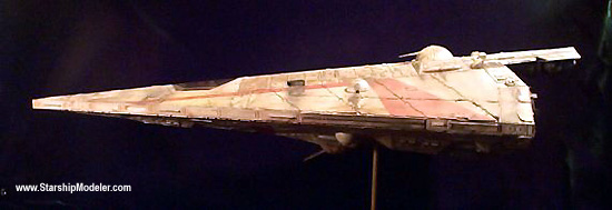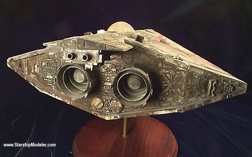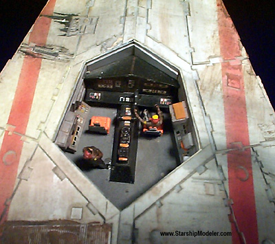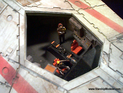 This is a scratch-built Scout Ship from the RPG Traveller. It is constructed from foam-core with applique' armor glued to it. 24 inches long, and 14 inches wide, it works out to 1/72nd scale. All of the graphics and tech info in the rulebooks never really fleshed out the workings of the scout. I made several drawings and deck plans to accurize it. The only "add-on" was the Jump-projector at the tail end over the engine ports. This was added to tell the top from the bottom. As you can see, without it, it would look basically the same. The figures are 1/72nd flight deck crew.