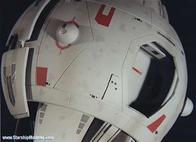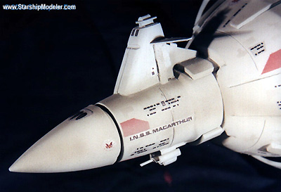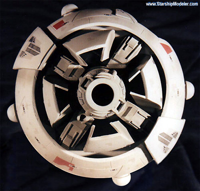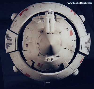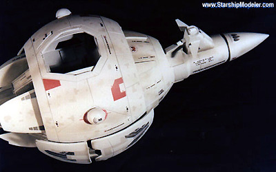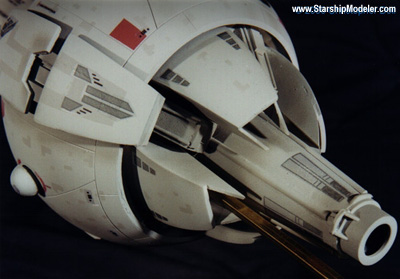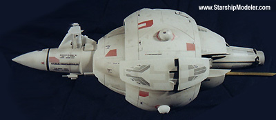 Scale: Not Stated This is my version of the I.N.S.S. MacArthur from Larry Niven and Jerry Pournelle's "A Mote in God's Eye". The model is 10" long and constructed from a variety of plastic spheres and cones, wood, and many pieces of sheet styrene. I consider this an interpretive work. It is well documented that Mr. Niven and Mr. Pournelle used the AMT Leif Ericson Galactic Cruiser model as inspiration for the MacArthur, and the description in the book alludes to this. However, I managed to view a videotaped presentation given by Larry Niven at a local convention which showed a series of designs from novels he wrote and contributed to, including the MacArthur. The early rounds clearly showed the origins of the design as being from the Leif Ericson, but they went on to become a more cylindrical ship. Later designs continued to bulk up the drive and landing bay area and they ended with an aggressive design that is close to what I modeled here. I was unable to videotape the presentation, but I had a sketchpad handy and made rapid notes. It is from these sketches that I designed this model. Image: Rear view Image: Port side Image: Overhead Image: Hull details Image: Aft details Image: Closeup of the sail |
